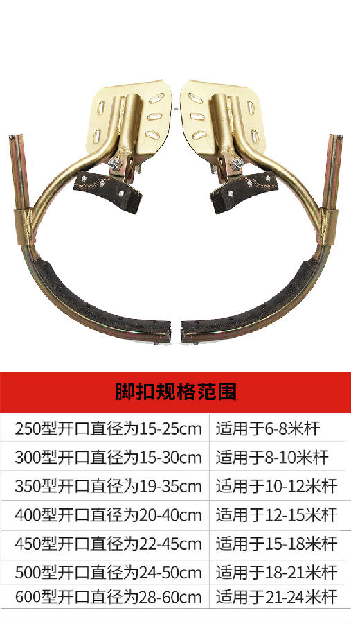 产品名称:SF-SN型登杆脚扣 产品材质:16锰钢无缝钢管 产品规格:250-600型,多种规格可选 产品用途:电工攀爬水泥杆 产品特点:淬火技术强化钢材 机器人焊接 安全可靠