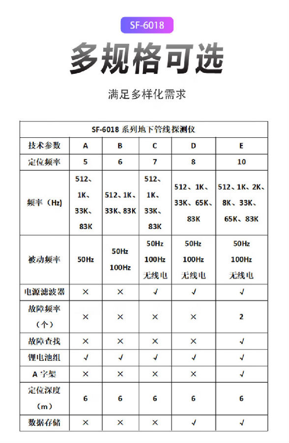 ⚪发射机 输出功率:最大10W 工作频率:128HZ、512HZ、1KHZ、2KHZ、8KHZ、33KHZ、65KHZ 工作模式:直连、感应和夹钳三种模式自动转换 ⚪接收机 深度测量精度:深度的士5%(无邻近管线干扰) 电流测量精度:实际电流的土5%(无邻近管线干扰) 深度测量范围:0-6米 工作模式:谷值模式、峰值模式、宽峰模式、峰值箭头模式 工作频率:无线电、50HZ、100HZ(CPS)、128HZ、512HZ、1KHZ、2KHZ、8KHZ、33KHZ、65KHZ 菜单设置:中英文设置菜单 ⚪性能 1.接收机和发射机都采用锂电池组供电,节能环保,超长工作时间; 2.显示器具有背光功能,可适应夜间应急抢险使用; 3.具有左右箭头显示,可快速定位管线位置。