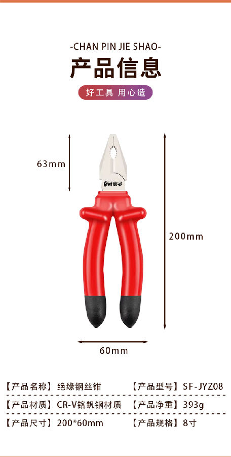 SF-JYZ08 铬钒钢材质 绝缘钢丝钳 老虎钳 多功能钳